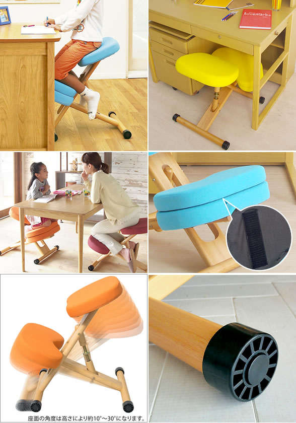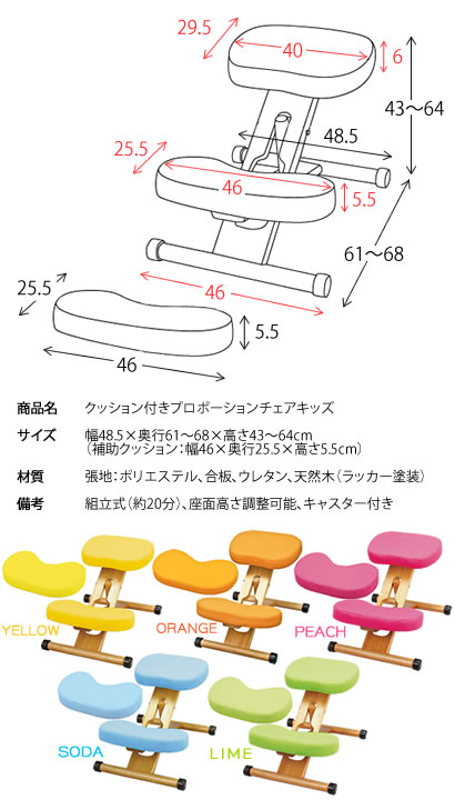 7、座り降りしやすいキャスター付き 8、お好みで選べるポップな5カラー 商品名クッション付きプロポーションチェアキッズ サイズ幅48.5×奥行61〜68×高さ43〜64cm(補助クッション:幅46×奥行25.5×高さ5.5cm) 材質張地:ポリエステル、合板、ウレタン、天然木(ラッカー塗装) 備考組立式(約20分)、座面高さ調整可能、キャスター付き