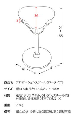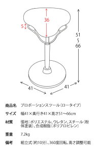 商品名プロポーションスツール(ロータイプ) サイズ幅41×奥行き41×高さ51〜66cm 材質張地:ポリエステル、ウレタン、スチール(粉体塗装)、合成樹脂(ポリプロピレン) 重量7.2kg 備考組立式(約10分)、360度回転、高さ調整可能